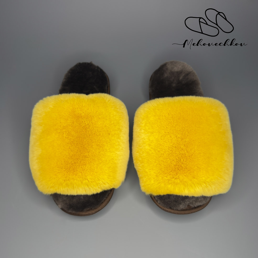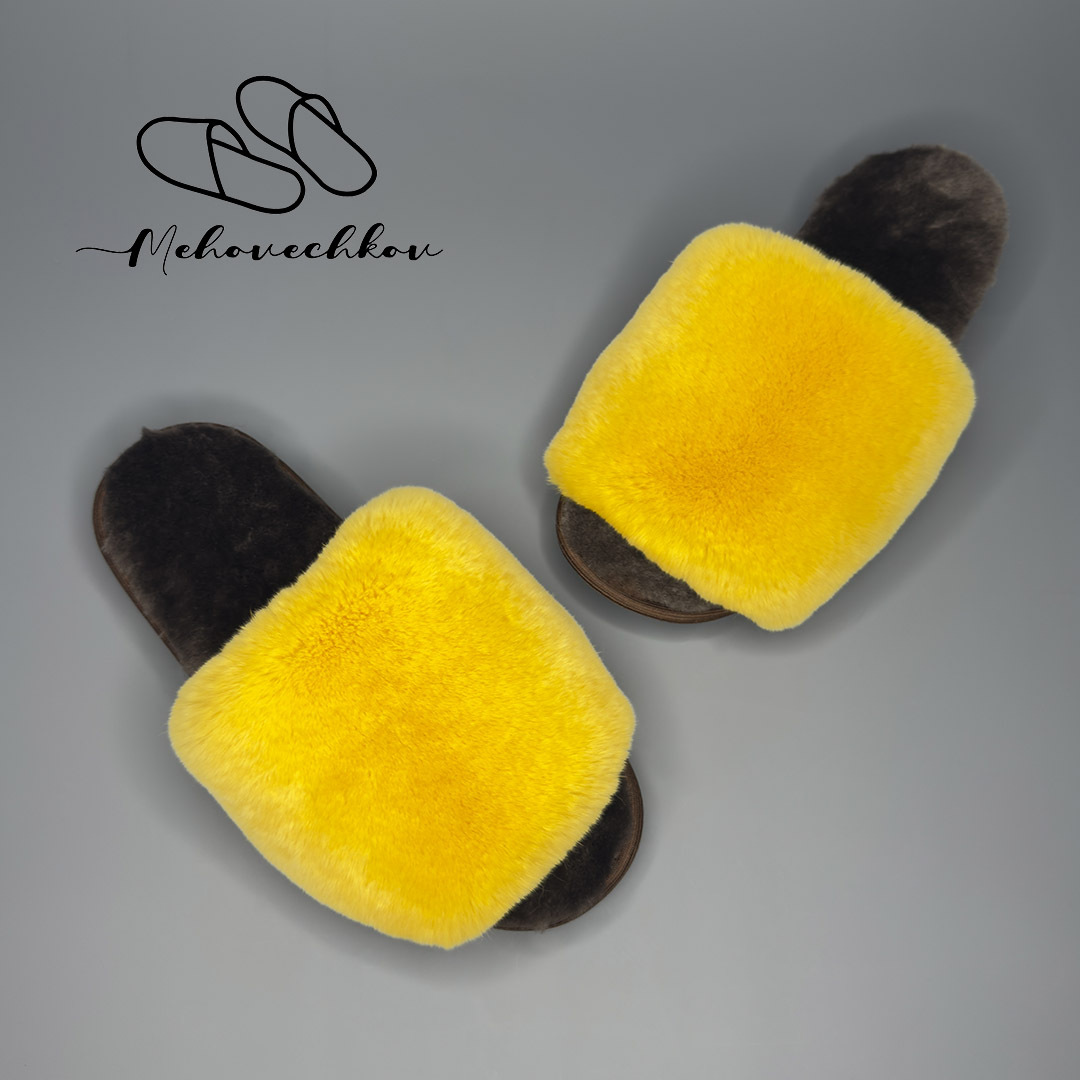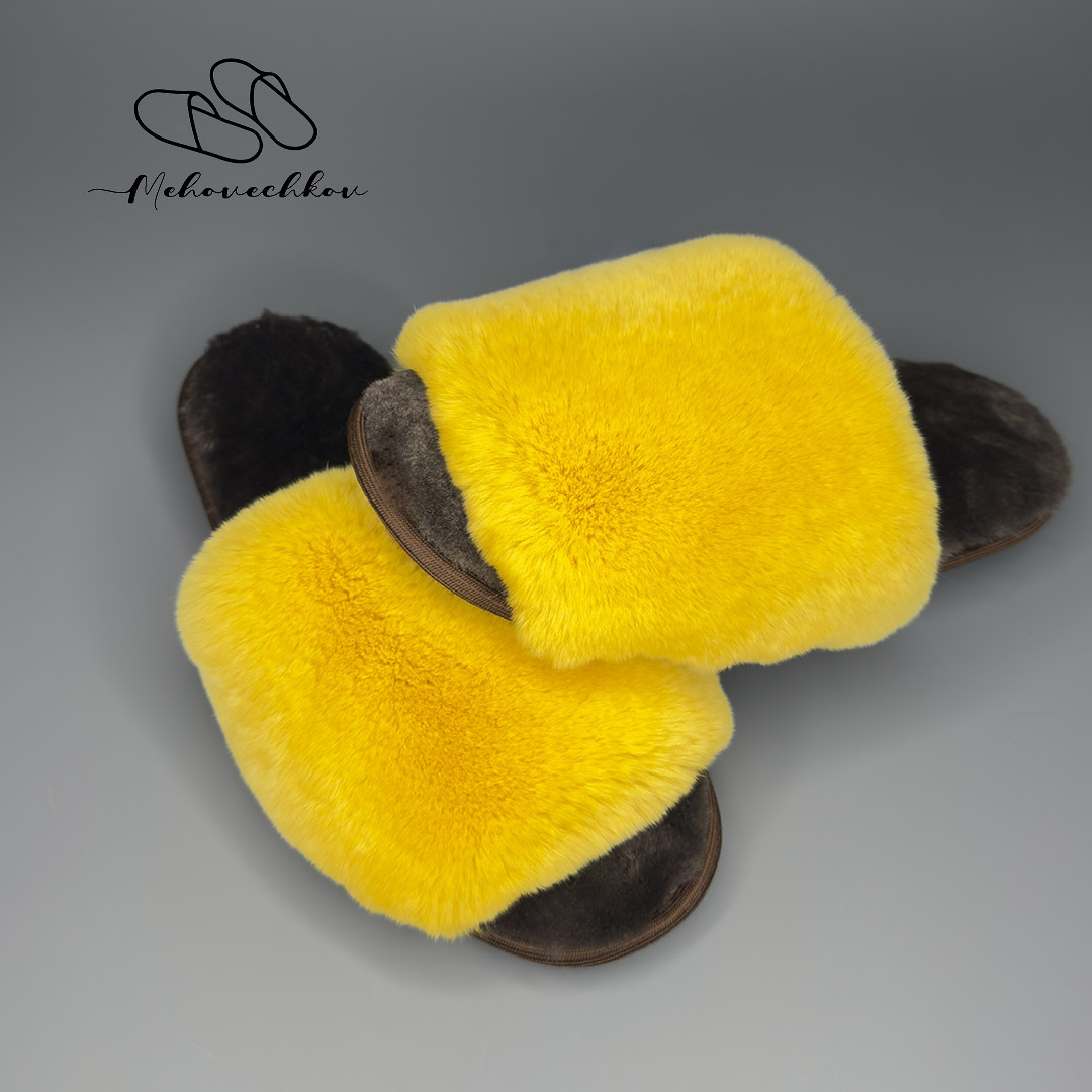 Верх изделия выполнен из натурального меха кролика породы Рекс цвет Горчичный